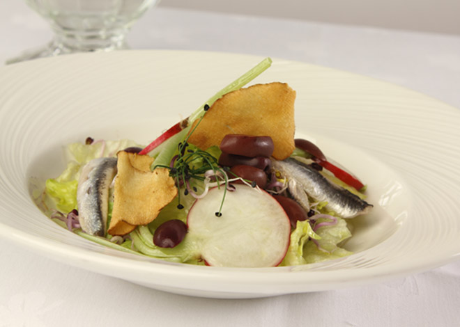 Den Salat grob schneiden und waschen, die Radieschen schneiden und mit den Sprossen und Oliven mit Essig, Salz, Zucker und Olivenöl marinieren, anrichten. Die Sardellen gut abtropfen, auf den Salat legen, den Salat zum Finish mit Topinamburchips oder anderen Gemüsechips garnieren. Dazu die Knolle dünne aufschneiden und die Scheiben in Öl knusprig frittieren und auf Küchenkrepp abtropfen lassen.