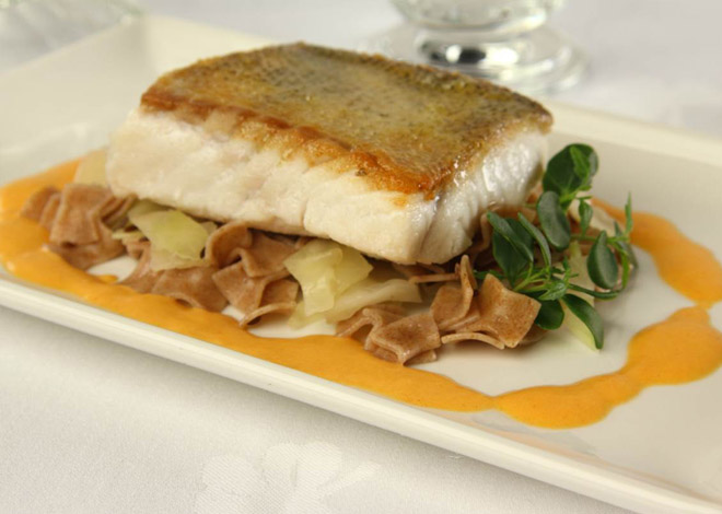 Für die Krautfleckerln Zwiebel und etwas Zucker in Olivenöl anschwitzen. Das Kraut mitrösten, mit Weißwein ablöschen, Gewürze beigeben und kochen lassen, bis die Flüssigkeit weg ist. Die Fleckerln beigeben und mit frischem Pfeffer abschmecken. Den Zander salzen und zuerst auf der Hautseite knusprig anbraten, kurz umdrehen und mit den Krautfleckerln und der Sauce anrichten.