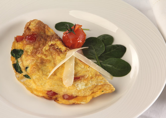 Die Eier aufschlagen, verrühren und salzen, in eine heiße Pfanne mit Butter gießen. Tomaten und Blattspinat nach Belieben beigeben, Parmesan hinzufügen. Wenn das Omelette fast durch ist zusammen klappen und servieren. Mit Parmesan bestreuen, mit Hanföl/Leinöl dezent beträufeln.