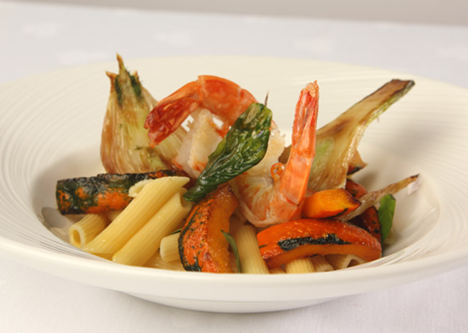 Penne mit geschmortem Kürbis, Fenchel, Basilikum und Scampi
